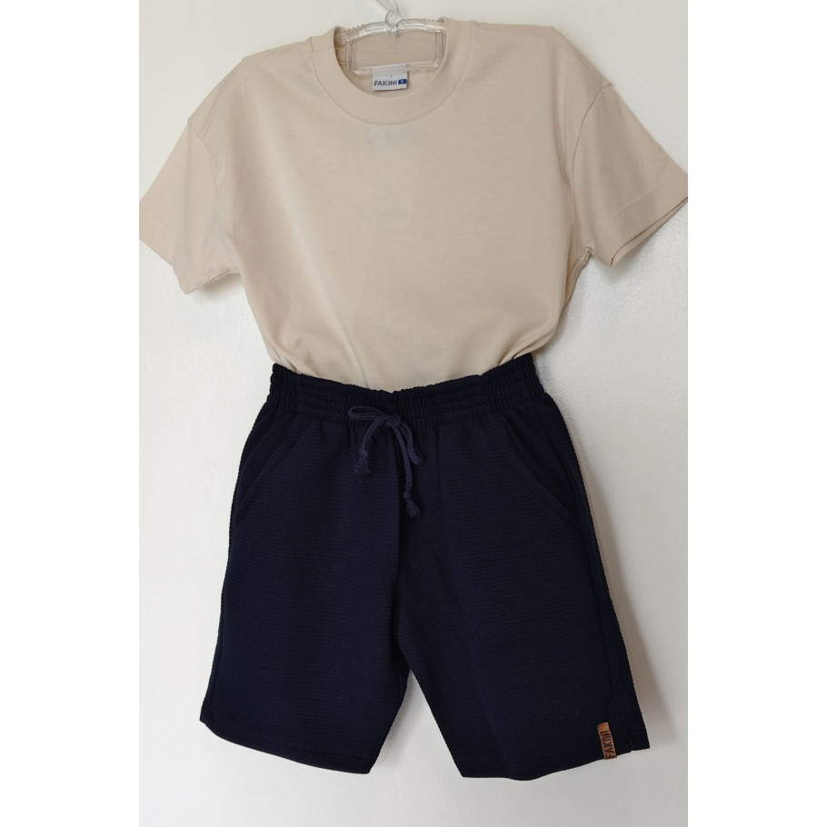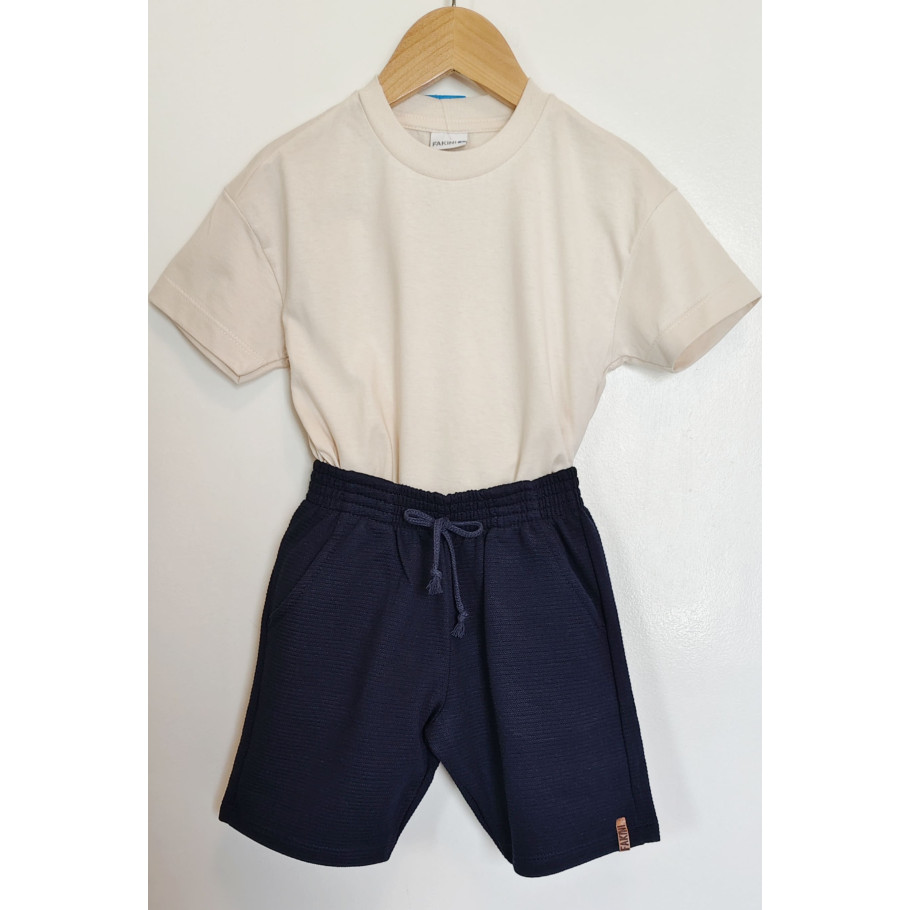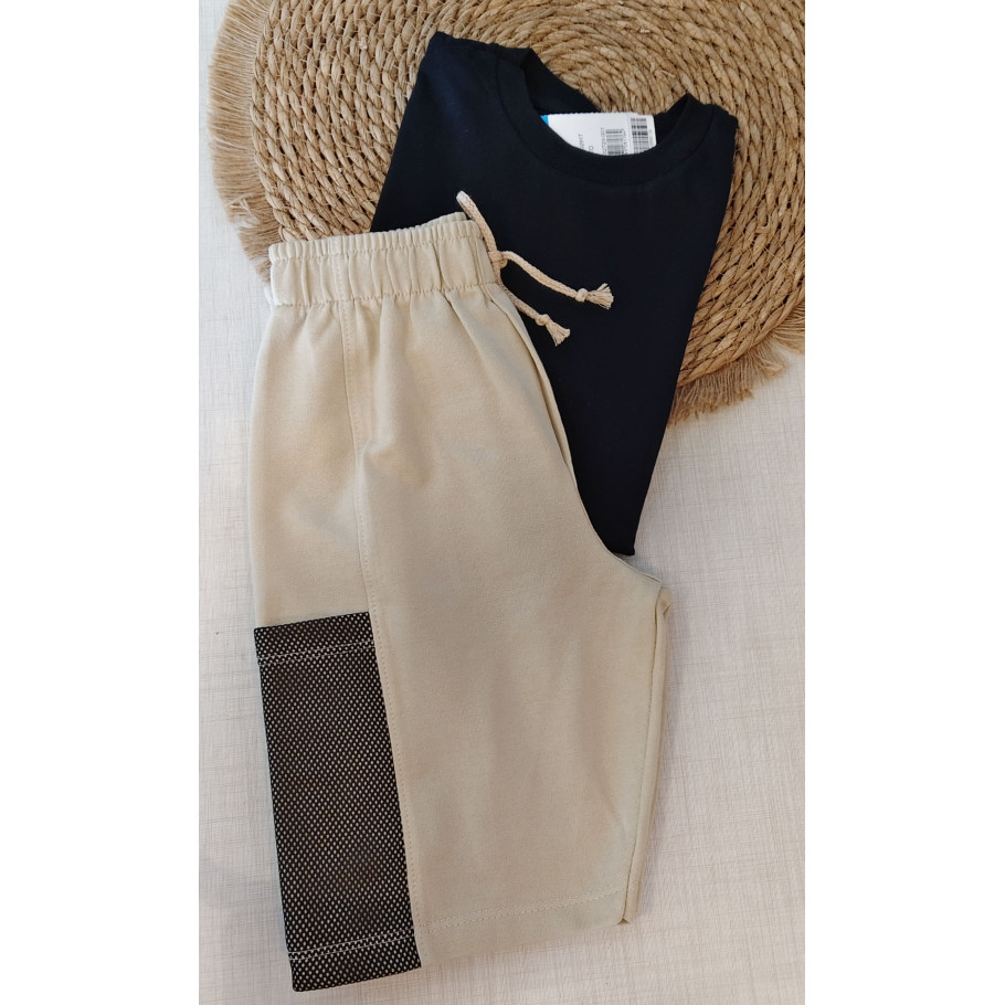 A camiseta preta básica combina com a bermuda bege com detalhes laterais pretos, criando um visual urbano e versátil para todas as ocasiões.
