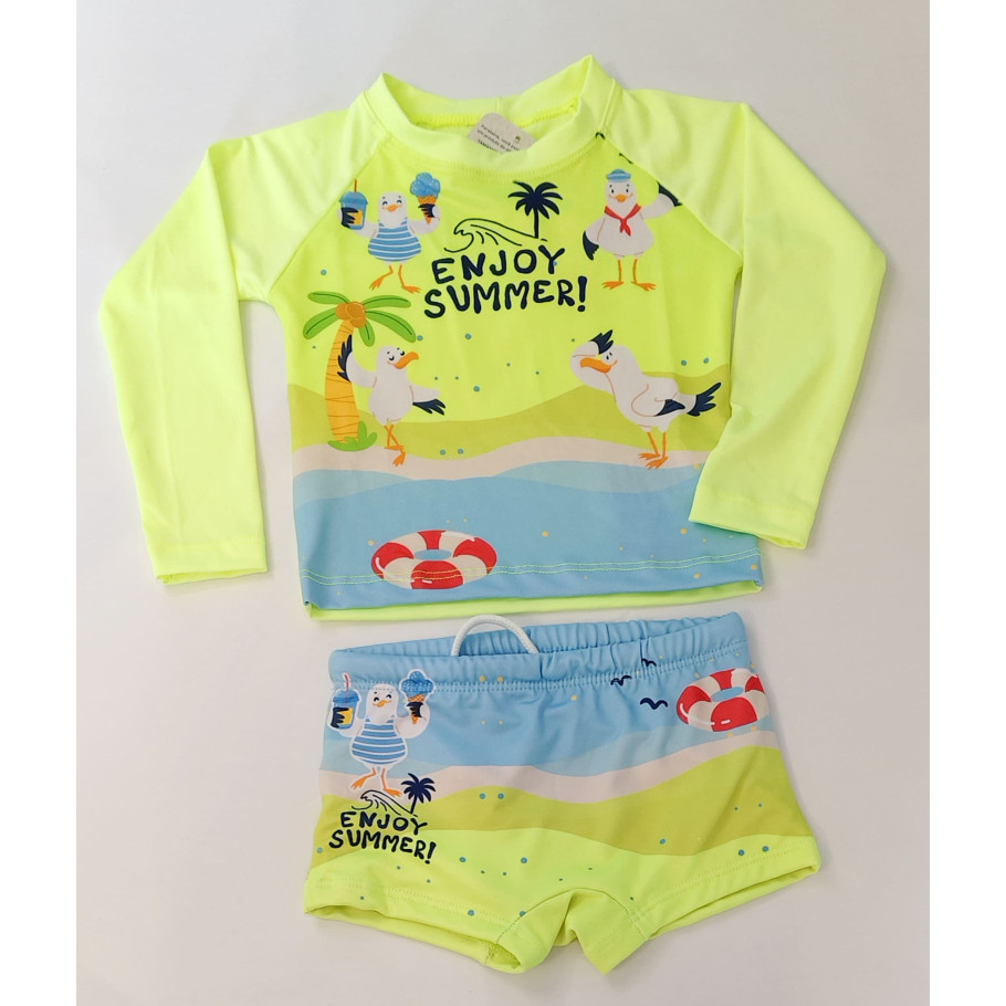 O conjunto praia infantil verão em malha sublimada com Fator UV 50 e forro em poliamida é leve, confortável e cheio de estilo. Uma peça essencial para o verão, que une proteção solar, qualidade e beleza, garantindo segurança e liberdade para as crianças se divertirem com o conforto.