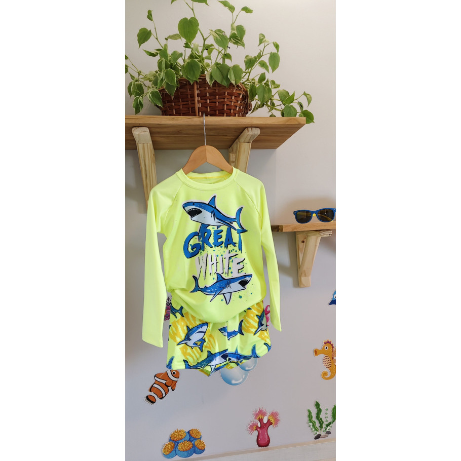 O conjunto praia verão em malha sublimada com Fator UV 50 e forro em poliamida é leve, confortável e cheio de estilo. Uma peça essencial para o verão, que une proteção solar, qualidade e beleza, garantindo segurança e liberdade para os meninos se divertirem com o conforto.